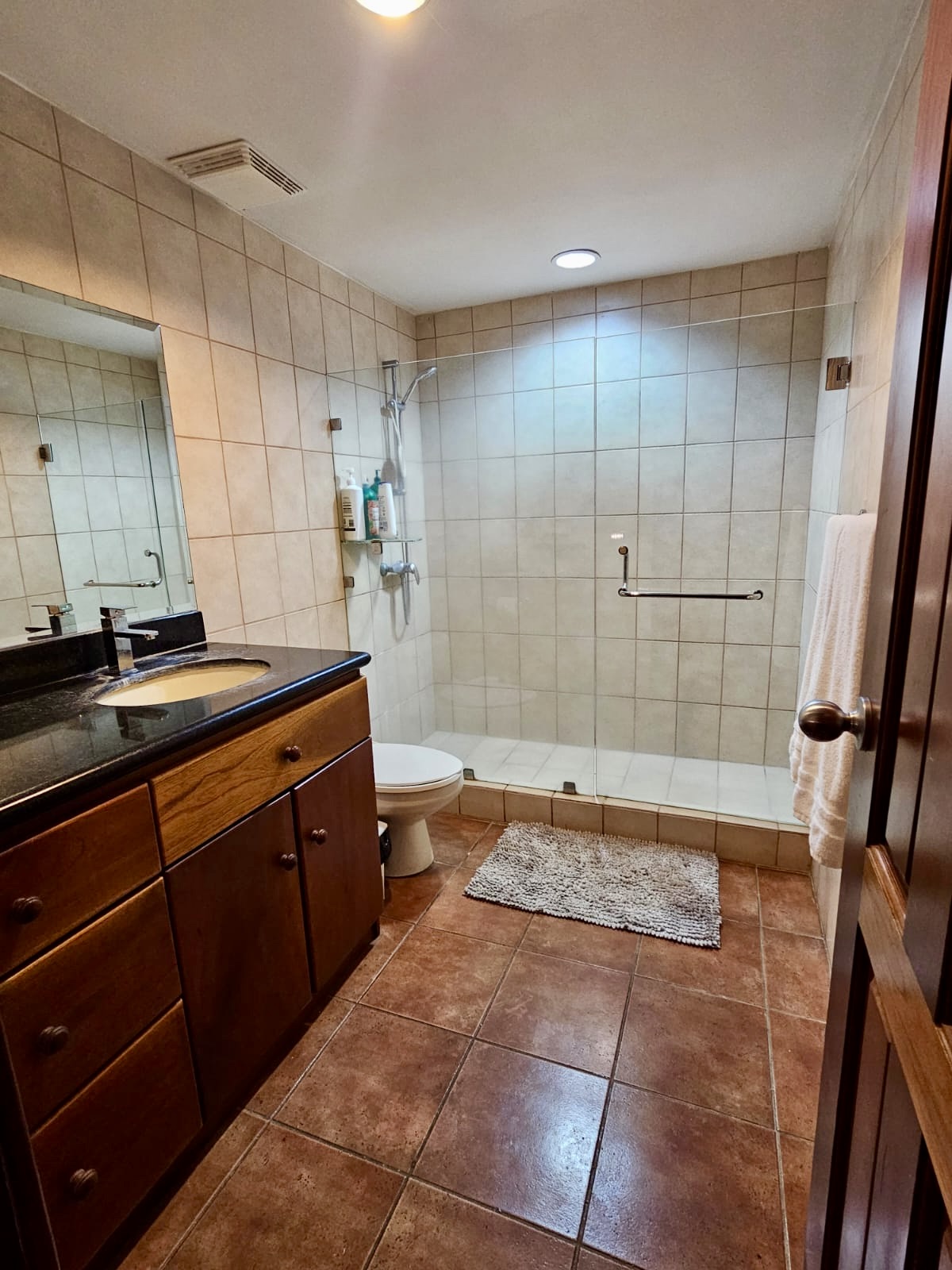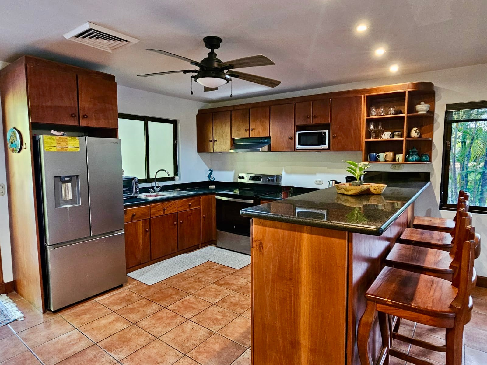 Designed with both style and practicality in mind, the home features traditional terracotta like tile flooring that adds warmth and character throughout. Large windows invite in natural light, creating an airy and welcoming atmosphere in every room. At the heart of the home, the open-concept living space flows seamlessly into a well-appointed kitchen, complete with solid wood cabinetry, sleek black granite countertops, and a raised breakfast bar—perfect for casual dining or entertaining.