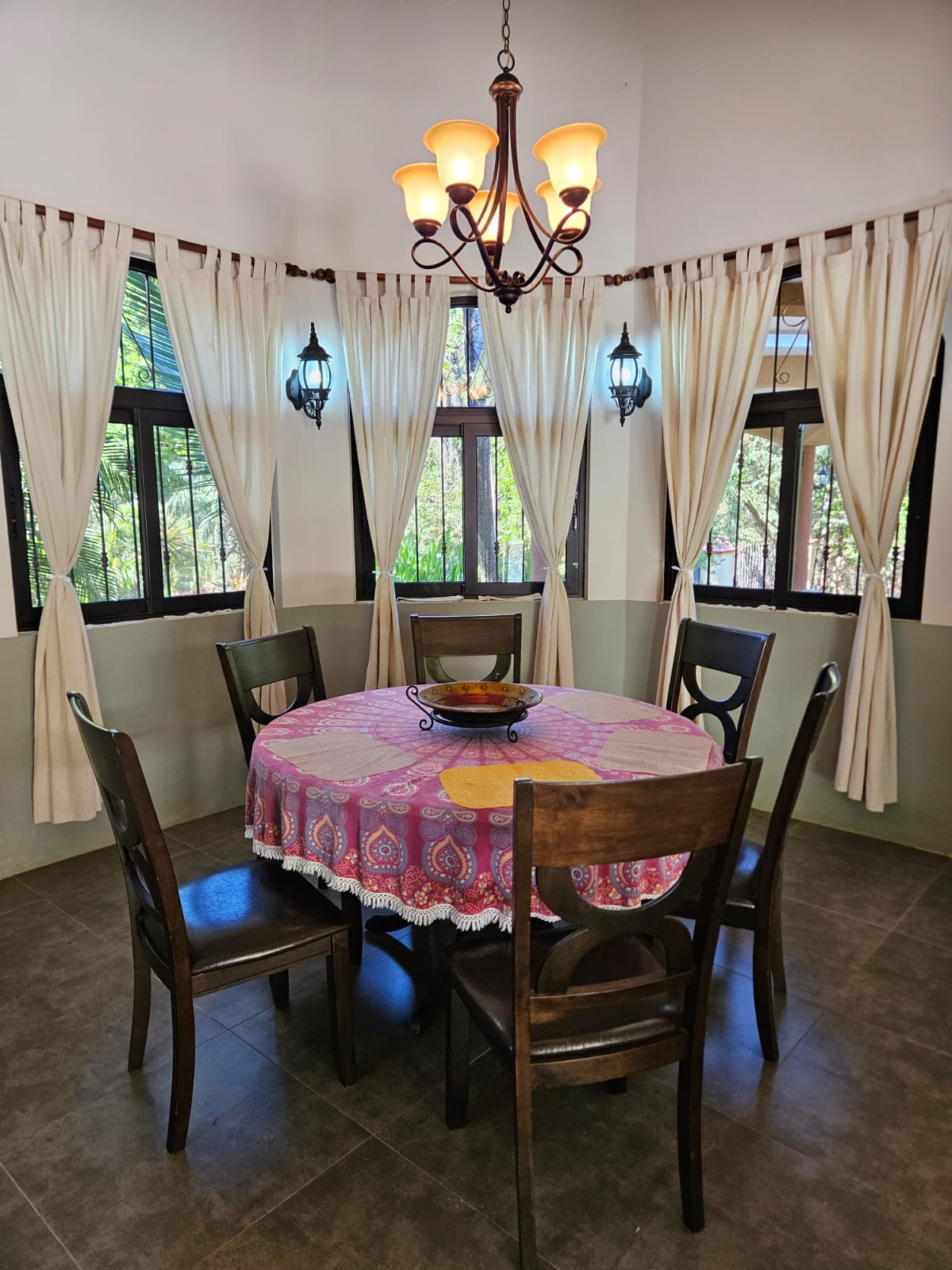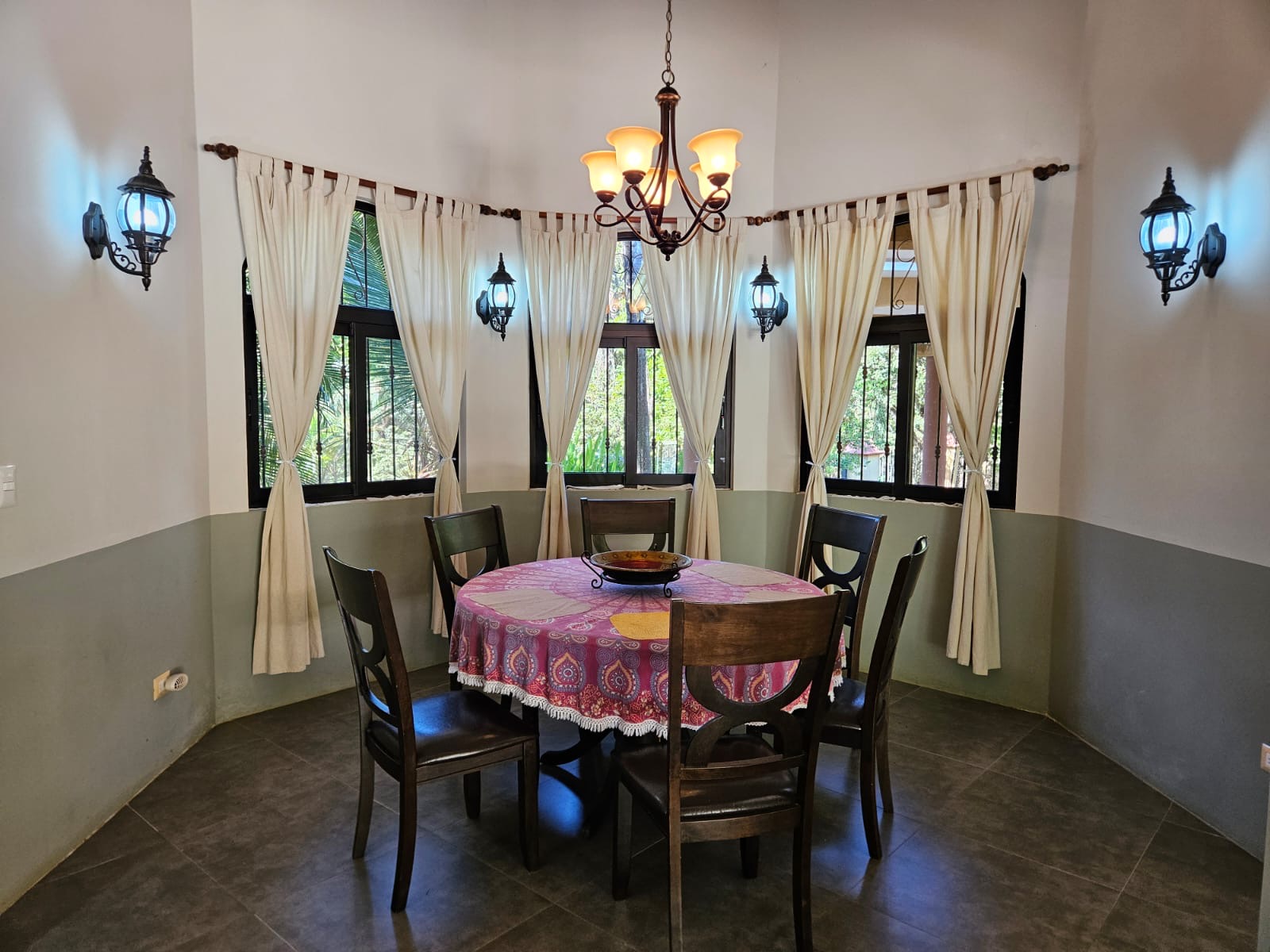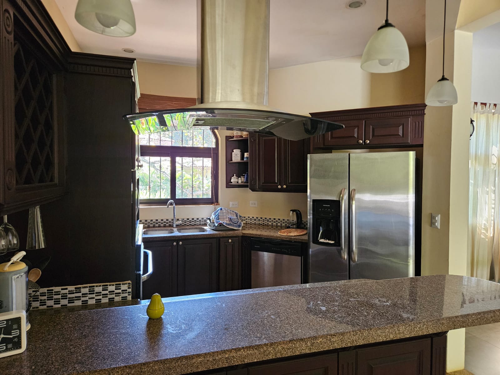The home welcomes you with a bright open-concept living and dining area, filled with natural light from surrounding windows that frame lush tropical views. The large dining area flows effortlessly into the kitchen, making it ideal for both everyday living and entertaining. The kitchen features sleek dark cabinetry, stainless steel appliances, a breakfast island, and a large picture window over the sink—perfect for enjoying the garden while you cook.